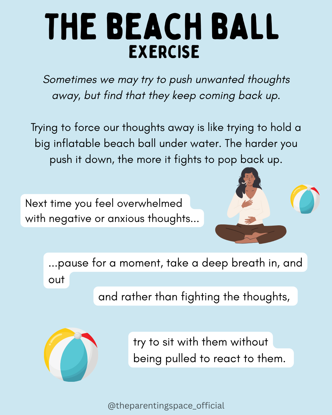 Just like a beach ball, trying to constantly push down negative or anxious thoughts can mean that they keep coming back. Instead, try letting thoughts float by, without fighting them or allowing them pull us off course.