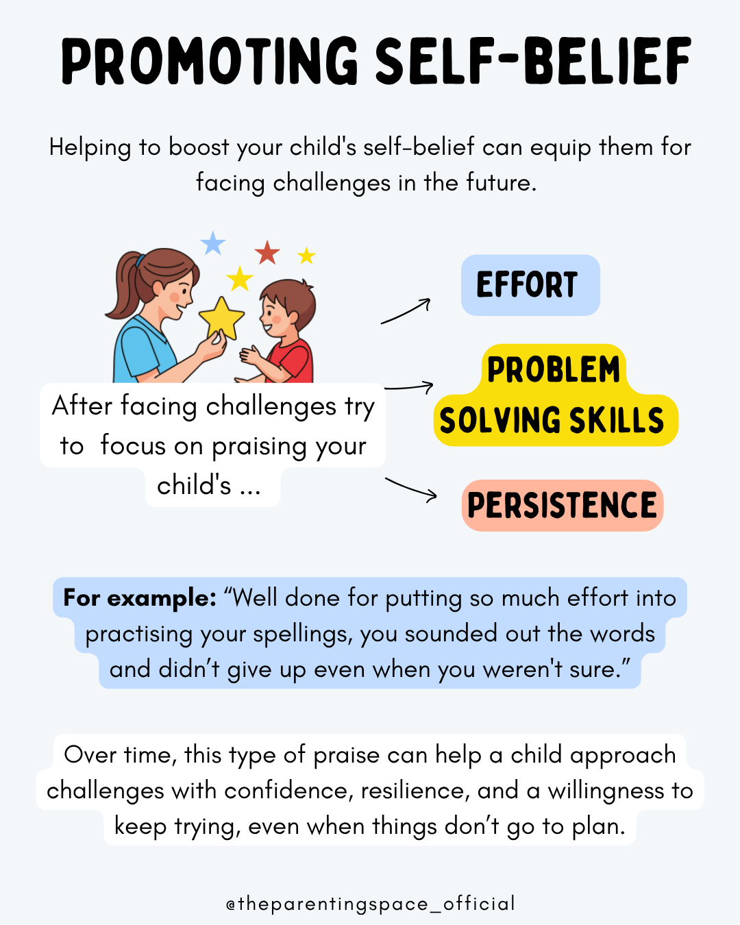 Praising effort, persistence and problem-solving skills, can boost your child’s self belief, helping them to face challenges in the future.